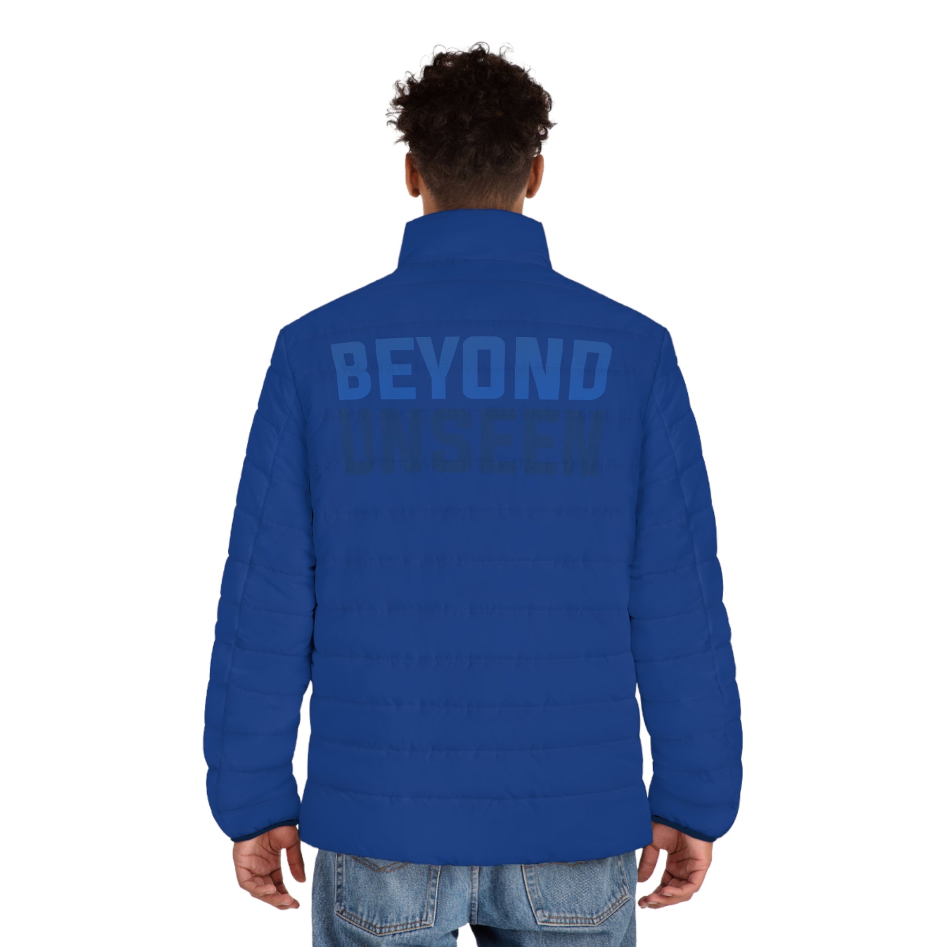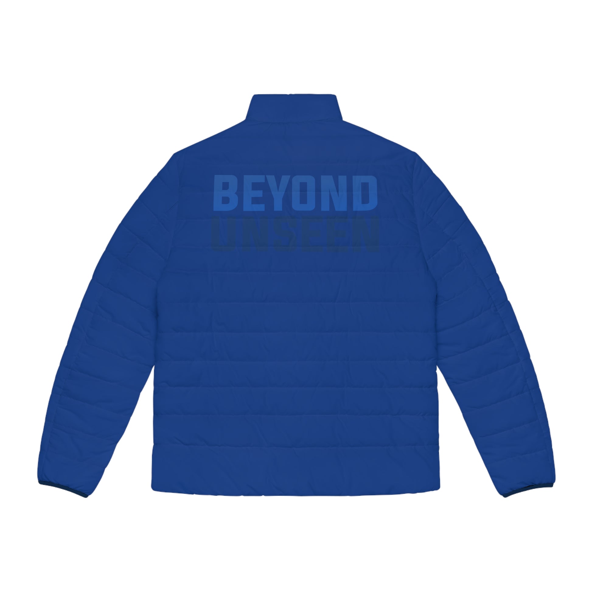A lightweight, quilted puffer that reads clean and confident. This jacket layers easily over tees and hoodies, giving a streamlined silhouette with practical warmth. The white shell and navy accents keep the look crisp while the bold “BEYOND UNSEEN” back print and minimalist chest mark make a quiet, assertive statement. Built with a soft, black cotton-like lining and elastic cuffs, it moves with you and locks in comfort during brisk mornings and evening walks.